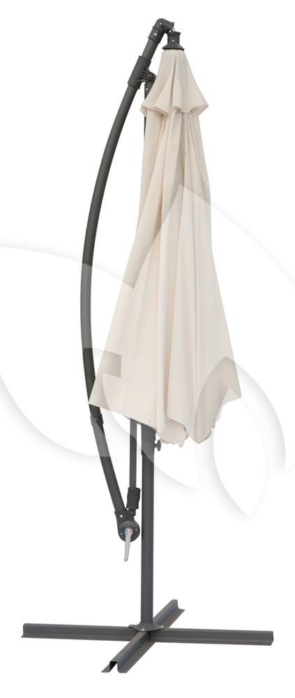 De zweefparasol is voorzien van een kruisvoet, deze dient echter nog wel verzwaard te worden door kruisvoettegels (niet inbegrepen). De parasol is uitgevoerd met een aluminium grijs frame in een neutrale ecru kleur. Uitklappen kost u weinig moeite door het handige draaimechanisme. Uw parasol houdt u lang mooi met een beschermhoes, deze kunt u optioneel bij bestellen.